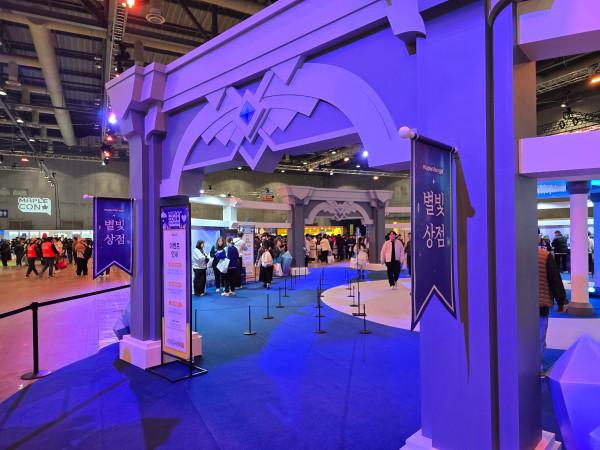 ‘별빛 상점’은 ‘메이플스토리M’ 오리지널 캐릭터인 ‘시아 아스텔’과 ‘에릴 라이트’의 고향 ‘오르트’와 ‘헬리아’ 지역을 콘셉트로 꾸며진 공간이다. 중앙에는 별자리 코인을 던져 소원을 비는 공간도 보인다.