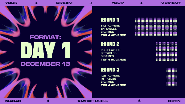 '전략적 팀 전투 마카오 오픈'에는 지난해와 마찬가지로 총 512명의 선수가 참가해 12월 13일부터 15일까지 경쟁을 펼친다. 프로 선수뿐만 아니라 인플루언서와 일반인까지 다양한 배경의 참가자들이 한자리에 모여 경쟁을 벌인다. 대회는 최종 8명이 남을 때까지 계속되며, 이들의 결승전은 대회 마지막 날인 15일에 진행된다.