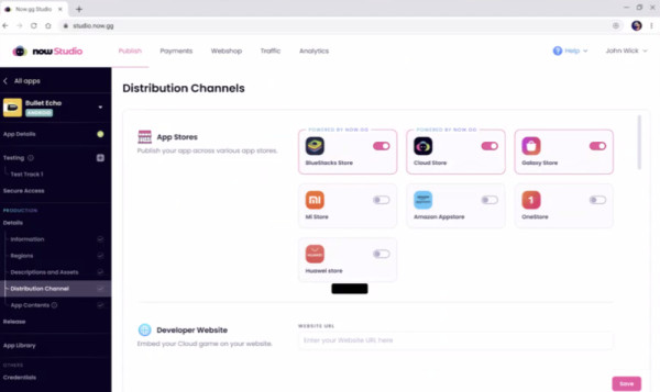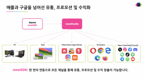 또한 많은 게임사들이 애플과 구글 이외에 게임 출시를 추진하고 있는데, 각 스토어마다 SDK를 적용해야 하는 불편함이 있다고 지적했다. 그리고 모든 플랫폼에 동시에 게임을 유통하는 방안을 마련했고, 그것이 나우스튜디오라고 소개했다. 한번의 연동으로 모든 플랫폼과 업체별 스토어, 브라우저 및 채널로 출시 할 수 있으며, 유통과 프로모션을 쉽게 할 수 있다고 한다.