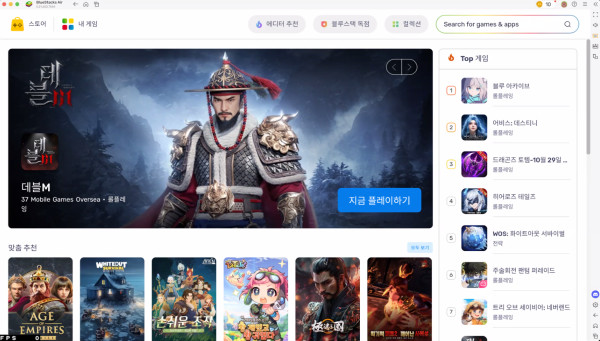 스토어 화면에는 국가별 인기 게임을 모은 ‘에디터 추천 게임’이 있고, 블루스택 독점 게임을 선보이는 항목도 존재한다. 타겟 국가가 있는 만큼 노출되는 게임은 차이가 있다. 현재 트리플A 게임 확보에 집중하고 있다고 한다.