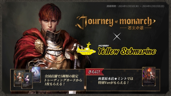 이번 컬래버레이션은 '옐로우 서브마린' 전 26개 매장에서 3천 엔(이하 모두 세금 포함) 이상 구매 시 컬래버레이션 한정 트레이딩 카드(총 5종)가 랜덤으로 1장씩 들어있는 팩을 수량 한정으로 받을 수 있다. 팩 안에는 '저니 오브 모나크' 게임 내 아이템을 받을 수 있는 쿠폰 번호 용지도 동봉되어 있다.