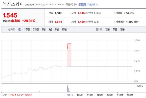 한편, 장현국 대표가 제3자배정 유상증자를 통해 50억원의 전략적 투자를 단행하고 액션스퀘어 신임대표로 내정된다는 소식으로 액션스퀘어 주가가 상한가를 달성했다. 12일 오전 9시 34분 기준 전일대비 29.94% 상승했다.