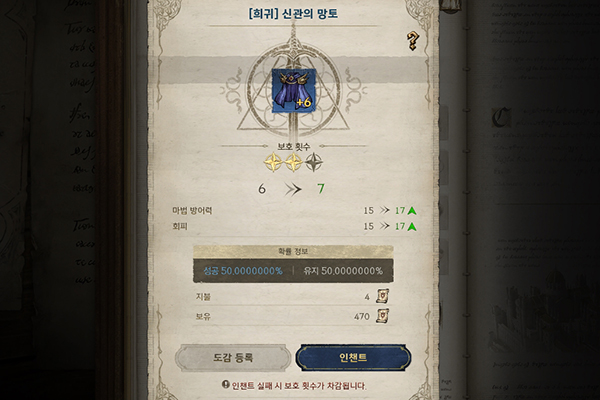 놀란 것은 인챈트에 실패해도 장비가 파괴되지 않는다는 점이다. 장비마다 3번의 보호 횟수가 있어 인챈트를 자유롭게 시도할 수 있으며, 보호횟수를 모두 소비해도 장비는 파손될 뿐 장착하여 스탯 효과를 적용받을 수 있다. 강화를 위한 강화 마법 주문서도 대량으로 배포해 인챈트를 원 없이 할 수 있으며, 장비 소멸에 대한 부담이 없다.