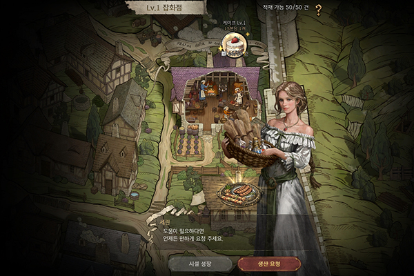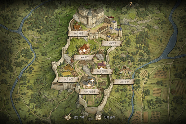 영지는 방치형에 SLG 장르의 느낌을 더한 콘텐츠다. 영지 내에 농장, 여관, 연금술, 잡화점 등 다양한 시설물을 건설하여 자원 및 아이템을 생산해 성장에 도움을 줄 수 있다. 특히, 세공에서는 주사위로 얻을 수 없는 군주의 액세서리를 만들 수 있으며, 연금술은 군주의 휘장과 피의 서약에 필요한 재화를 생산하여 덱의 전투력을 높이는 성장 요소로서 중요한 역할을 한다. 영지는 혈맹과 함께 커뮤니티 카테고리에 있는 만큼 향후 다른 유저와의 협업 콘텐츠로도 활용할 수 있어 발전 가능성도 기대를 모은다.