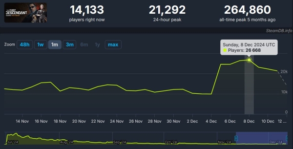 실제로 '퍼스트 디센던트'는 시즌2 '보이드 추적'을 통해 반등에 성공했다. 스팀 DB에 따르면 기존에 시즌2 업데이트 전까지 만 명을 웃돌던 동시접속자는 시즌2 패치 이후 약 2만 6천여 명으로 단숨에 뛰어올랐다. 콘솔 플랫폼까지 고려하면 확실히 많은 유저가 게임으로 복귀하거나 신규 유저가 늘어난 것으로 보인다.