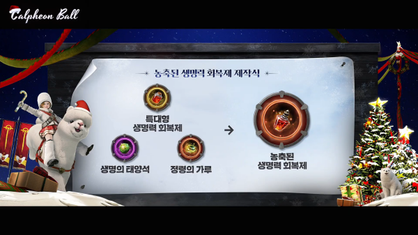 반드시 생존할 수 있는 상황에서 요긴하게 사용되는 농축된 생명력 회복제를 제작할 수 있다. 제작에는 특대형 생명력 회복제와 생명의 태양석, 정령의 가루가 필요하다. 정령의 가루는 카마실비아 전지역에서 사냥을 통해 획득할 수 있다. 한국은 1월 7일, 글로벌은 1월 21일 업데이트된다.