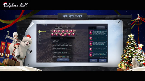 새롭게 등장한 기억 각인 프리셋은 기억 각인을 장착할 수 있는 슬롯이 있어 한 눈에 프리셋의 효과를 손쉽게 확인할 수 있다. 편의성을 위해 검색 기능을 추가해 특정 모험가의 세팅을 검색할 수 있으며, 프리셋을 복사하는 기능도 지원한다. 한국은 12월 17일, 글로벌은 12월 31일 업데이트된다.