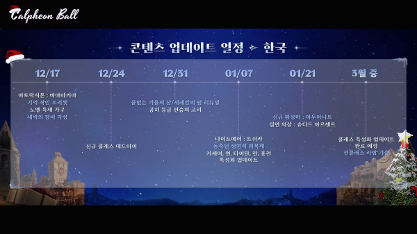 올해 칼페온 연회는 MC 허준, 레이라의 진행과 함께 안형규 게임디자인 실장의 업데이트 콘텐츠 소개로 꾸며졌다. 안형규 게임디자인 실장은 “이번 업데이트 내용에는 그동안 모험가들이 건의해 주신 의견이 많았다”라며, “연회를 준비하면서 새로운 콘텐츠를 선보이게 되어 기대가 됐고, 연회라는 이름에 걸맞게 모험가들에게 감사하는 마음을 표현하고 싶었다”고 전했다.
