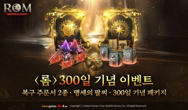 레드랩게임즈(대표 신현근)는 자사가 개발하고 카카오게임즈(대표 한상우)와 함께 글로벌 동시 서비스를 진행중인 정통 하드코어 MMORPG ‘롬(ROM: Remember Of Majesty)(이하 롬)’의 글로벌 서비스 정식 출시 300일 기념 이벤트를 진행한다고 19일 밝혔다.