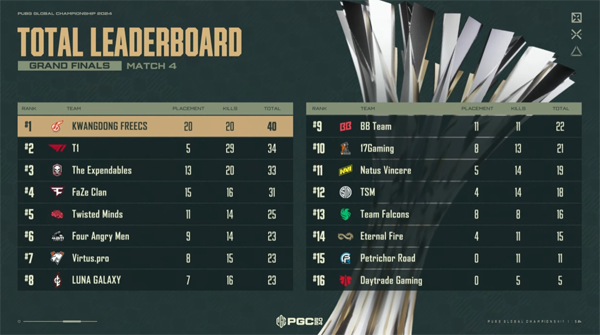 한국팀 광동과 T1의 활약이 PGC 2024 그랜드 파이널(GF) 경기에서 이어졌다. 론도에서 열린 매치4에서 광동은 버투스 프로와 팔콘스의 추격을 뿌리치고 치킨을 가져가 종합 1위로 올라섰다. T1도 좋은 경기 운영으로 종합 2위에 등극했다.