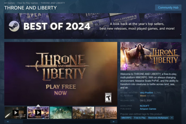 엔씨소프트(공동대표 김택진, 박병무, 이하 엔씨(NC))의 MMORPG ‘THRONE AND LIBERTY(쓰론 앤 리버티, 이하 TL)’가 스팀(Steam) ‘베스트 오브 2024(Best Of 2024)’ 3개 부문에서 ‘골드’ 등급으로 선정됐다.