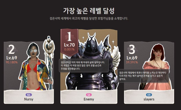 검은사막에서 가장 높은 레벨을 달성한 모험가는 누구일까? 전 세계에서 가장 높은 레벨은 70레벨로 남미 권역 모험가가 영예의 1위를 차지했다. 북미 권역과 한국 권역 모험가 각 69레벨로 그 뒤를 잇고 있다.