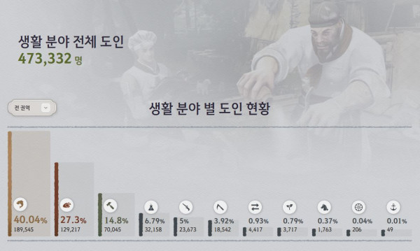 생동감 있는 전투뿐 아니라 낚시, 요리, 연금 등 다양한 생활 콘텐츠를 즐길 수 있는 검은사막인 만큼 각 분야에서의 고수들이 존재한다. 각 생활 숙련 레벨은 초급, 견습, 숙련, 전문, 장인, 명장, 도인 순으로 구분되어 있다. 검은사막 생활 분야에서 도인을 달성한 모험가는 총 473,332명으로 집계됐다. 그중 최고 레벨인 도인을 가장 많이 배출한 생활 콘텐츠는 낚시로 총 189,545명의 모험가가 도인을 달성했다.