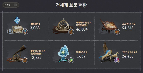 많은 모험가들이 노력의 결실인 보물을 제작해 소유하고 있었다. 보물별로 살펴보면 ‘라피 베드마운틴의 개량형 나침반’은 46,804명, ‘라피 베드마운틴의 개량형 망원경’은 12,822명, ‘거상의 반지’는 3,068명 등이다. ‘고고학자의 지도’는 전체 보물 보유율 중 1위를 차지해 가장 선호/모험에서 필요로 하는 보물로 선정됐다. 1개의 보물을 제작하기에도 많은 노력과 시간이 드는 보물을 모두 보유 중인 가문은 140개로 나타났다.