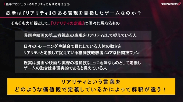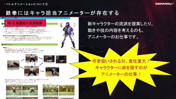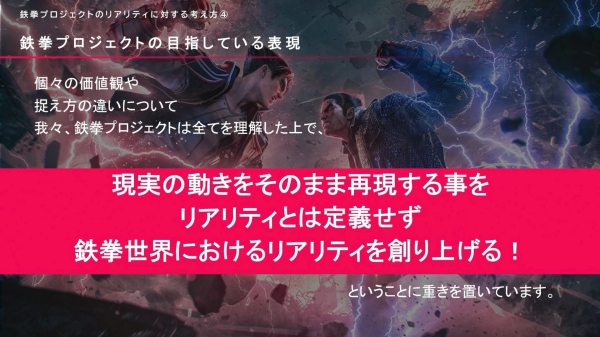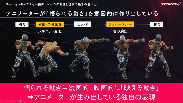 게임다운 움직임은 현실과 다르지만, '철권'은 격투기 시뮬레이터가 아니다. '철권' 세계에서의 리얼리티를 만들어내는 것이 애니메이터의 일이다.
