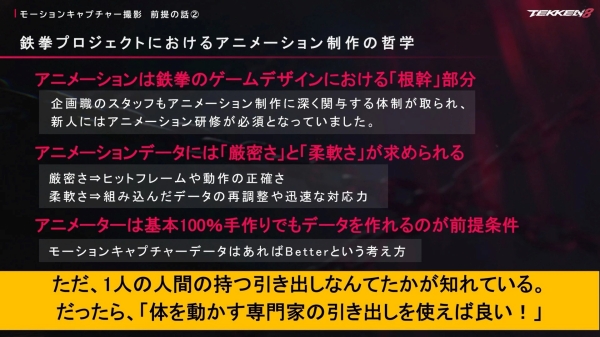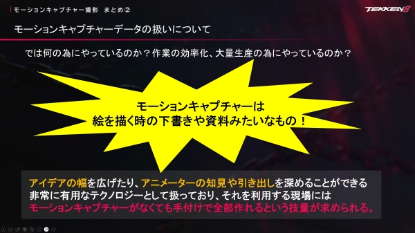 야마기시는 “한 사람이 가진 서랍은 한계가 있기 때문에 몸을 움직이는 전문가의 서랍을 사용하면 된다”고 말했다. '철권' 시리즈에서 모션 캡처는 토대나 밑그림, 애니메이터의 지식을 깊게 하는 자료라고 할 수 있다.