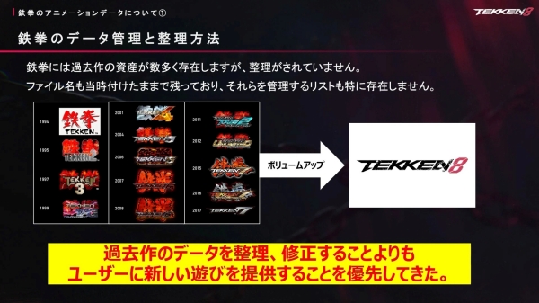 '철권' 시리즈는 과거 작품의 애니메이션 데이터를 그대로 사용하지만, 파일명도 과거의 것을 그대로 사용해 굳이 정리하지 않는다. 야마기시는 '철권' 프로젝트에 합류했을 때 정리하지 않은 것에 놀랐다고 하는데, "정리할 시간이 있다면 새로운 데이터를 만들자"는 생각으로 사양서가 만들어지기 전부터 모션 작업을 진행했다고 한다.