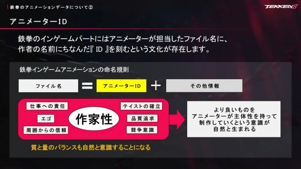 또한 파일 이름에 '애니메이터 ID'가 포함되어 누가 만들었는지 바로 알 수 있는 것도 '철권' 프로젝트 특유의 문화라고 한다. 애니메이터 ID가 존재함으로써 신인과 베테랑이 동등한 위치에서 평가받고, 질과 양의 균형을 의식하게 된다.