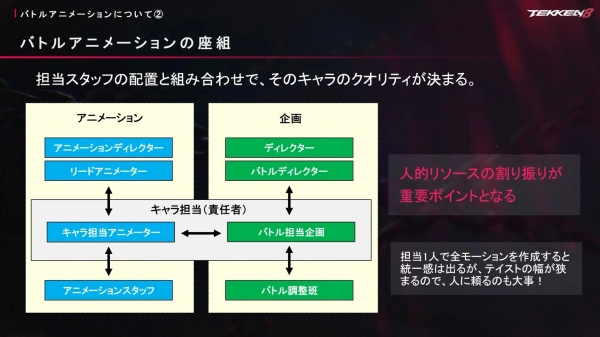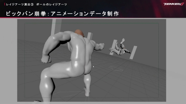 '철권 8'은 2명의 캐릭터가 싸우는 3D 대전 격투 게임이다. 캐릭터의 움직임을 만들 때 배우나 격투가의 움직임을 데이터화하는 모션 캡처가 사용되고 있지만, 그것만으로는 게임에 사용할 수 없다. 애니메이터가 게임 콘셉트에 맞게 수정해야 비로소 게임다운 움직임이 된다.