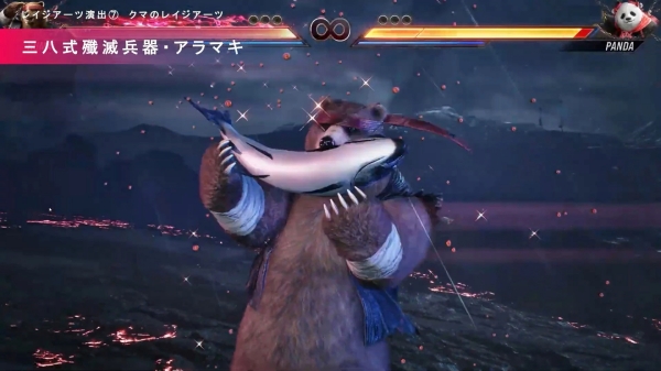 쿠마의 레이지 아츠 '38식 섬멸병기 아라마키'. 개발 중반에 만들어졌기 때문에 그림 콘티가 아닌 V 콘티(위 사진)가 사용되었다. V 콘티에서는 손에 든 연어가 튀어 오를 때 마크가 있지만, 구현 시에는 변형될 때까지 마크가 나타나지 않는다(아래 사진). 참고로 변형하는 연어의 모티브는 1975년 특촬물 '아크마이저 3'에 탑승하는 공중전함 '자이다벡호'라고 한다.