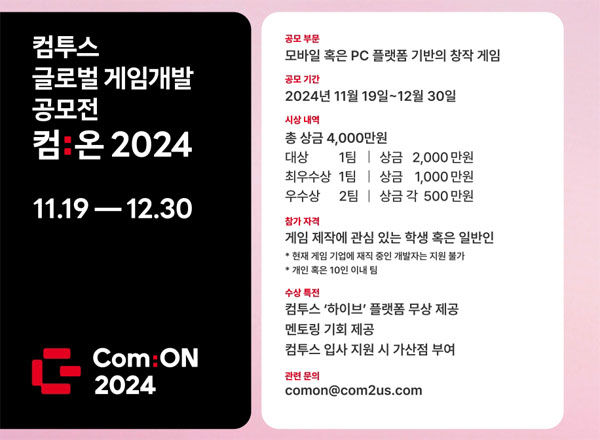 이번 공모전에 대한 보다 자세한 정보 및 추후 수상작 발표는 컴투스 글로벌 게임개발 공모전 ‘컴:온 2024’ 공식 웹사이트를 통해 확인 가능하다.