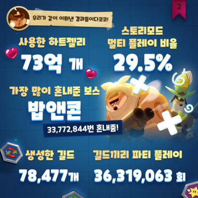 유저는 모바일 게임에서 흔히 볼 수 없는 협동액션을 통해 친구∙가족∙연인과 ‘함께하는 재미’를 충분히 즐기고 있는 것으로도 나타났다. 일반적으로 혼자 플레이하는 스토리 모드에서 다른 유저와 함께 스테이지를 클리어하는 멀티플레이 비율이 약 30%로 높게 나타났다.