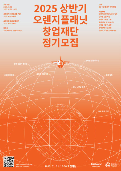 스마일게이트 오렌지플래닛 창업재단 (이하 ‘오렌지플래닛’, 센터장 서상봉)이 2025 상반기 정기모집을 시작한다고 6일(월) 밝혔다.