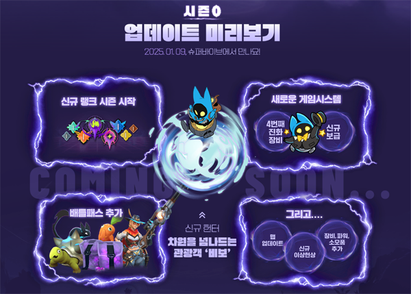 이와함께 '슈퍼바이브' 시즌0 예고 콘텐츠에서는 패치로 등장할 변경점들이 미리 소개됐다. 지형의 변화를 통해 그 밋밋했던 구간들을 더욱 다채롭게 만들었고, 새로운 변수 창출을 위해 네 번째 장비와 진화 콘텐츠를 도입한다.