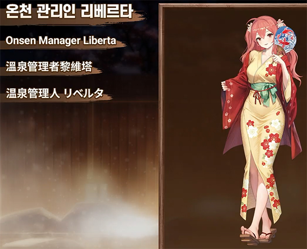 ▲온천 관리인 리베르타는 설산 온천에서 일하는 아르바이트생으로서, 블레이드와 함께 학창시절을 보냈다는 콘셉트다. 아군에게 공격과 회피 관련 버프를 부여할 수 있으며, 흡수 재능 스킬도 가지고 있다.