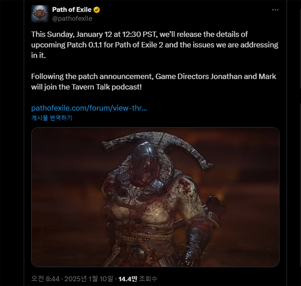 그리고 1월 10일, 그라인딩 기어 게임즈는 공식 채널 등을 통해 신규 패치 버전인 0.1.1 업데이트를 예고했다. 한국 시간으로 1월 13일 새벽, '패스 오브 엑자일' 공식 트위치 채널에서 패치 세부 내역을 요약한 발표 영상이 공개된다.
