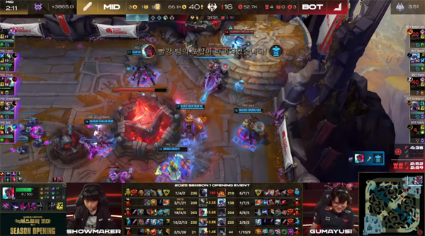 매치는 초반부터 난타전이 펼쳐졌다. 바텀의 지속되는 견제와 교전으로 인해 퍼스트 블러드는 원딜 팀이 가져갔으나, 이즈리얼을 선택한 미드 팀 쇼메이커는 반격으로 3킬을 쓸어 담으면서 더 많은 이득을 확보했다.