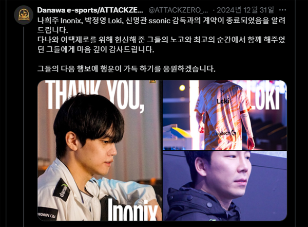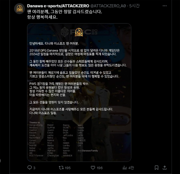 다나와는 지난 12월 31일, 모든 소속 선수들과 코치진들과의 계약 종료를 발표하면서 이별을 예고했다. 그리고 1월 13일 오후, 공식 해체 공지문을 통해 다나와의 행보가 2025년에는 이어지지 않을 것임을 전했다.