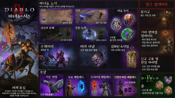 마지막으로, 풍성한 시즌 보상도 함께 선보인다. 새로운 고유 및 전설 아이템이 전리품으로 등장하며, 증오의 그릇 확장팩을 보유하고 있다면 세 개의 신규 룬 및 다수의 기존 룬 업데이트도 경험할 수 있다. 마녀단의 호의 단계를 높이고, 시즌 여정을 통해 전용 애완동물인 큰까마귀 애완동물과 같은 보상을 획득하거나, 배틀 패스를 진행하여 더 많은 전리품을 획득할 수 있다.
