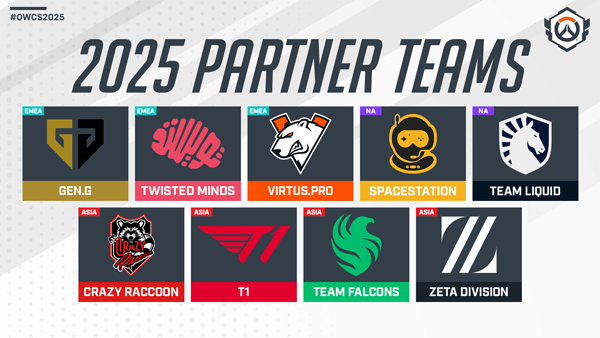 2025 시즌의 글로벌 ‘오버워치2’ e스포츠는 한층 확대한 규모로 돌아온다. 먼저 팀 파트너 프로그램을 신설해 새시즌에서 함께할 9개 팀을 선정했다. EMEA와 북미, 아시아 권역에서 활동할 팀들이 이름을 올렸으며 2024년 맹활약을 펼친 팀 팔콘스와 크레이지 라쿤은 물론 새롭게 합류한 T1과 젠지(EMEA)까지 합류했다.