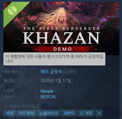 유저들은 "앞으로 소울류 입문작은 무조건 카잔", "아트 컨셉도 너무 잔인하지 않고, 던파 IP를 잘 표현한 것 같다", "소울라이크류 처음 해보는데 재미있었어요"라며 긍정적인 의견을 피력했다.