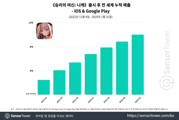 '니케'는 2022년 11월 4일 출시 후 미국, 일본, 한국 등 전 세계 주요 모바일 게임 시장 다운로드 차트 1위를 석권했다. 반짝 인기에 머무르지 않고 계속해서 인기를 이어나가며 서비스 약 2년 3개월 만에 전 세계 누적 매출 약 10억 달러를 달성했다.