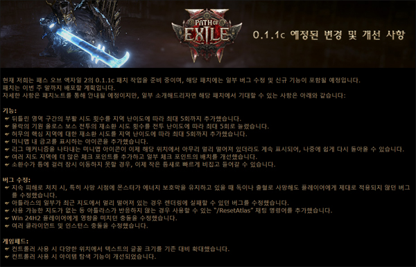 2월 5일의 0.1.1c 패치에서는 엔드 게임 밸런스 수정부터 편의성 강화가 이뤄진다. 특히 '패스 오브 엑자일2'의 최종 보스 콘텐츠에 대한 난이도 하락 작업이 진행된다. 높은 난이도로 유저들에게 도전과 좌절을 불러온 보스 콘텐츠에 부활 기회를 5번까지 제공하는 변경안을 추가했다.