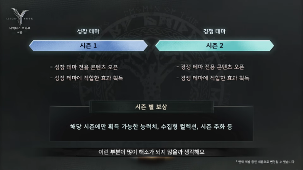 MMORPG의 반복 패턴에서 벗어나 신선한 재미를 주기 위한 시즌제 콘텐츠도 준비 중이며, 이는 거버넌스 시스템으로 연결된다. 이벤트 내용 및 보상, 시즌 매칭 서버 선정 등 투표에 직접 참여할 수 있는 재미 요소로 만들어졌다. 여기에는 생활 콘텐츠를 통해 획득하는 거버넌스 주화가 사용된다.
