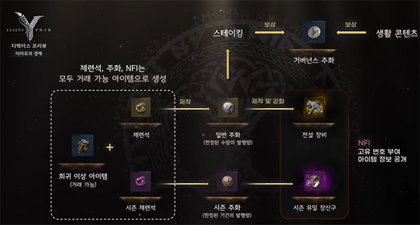 경제적 가치를 위해 그간 위메이드가 선보였던 ‘미르4’와 ‘나이트 크로우’처럼 블록체인 기술을 접목한 혁신적인 경제 시스템도 선보인다. 게임 내 아이템 가치 보존을 위해 장비 생산과 거래에 필요한 주화의 전체 수량을 제한한다.