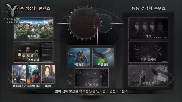 또 ▲사가 ▲검은 발키리 ▲뷰 포인트 등이 깊은 몰입감에 집중한 수동 기반의 능동형 성장 콘텐츠이며, 두 형태를 합친 ▲원정 ▲미미르의 샘 등의 콘텐츠도 있다.