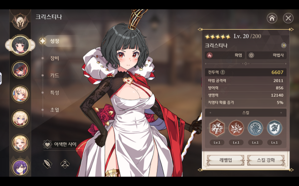 캐릭터 성장은 레벨업, 특성, 초월 등이 존재하며 등급으로 분류된 장비를 착용해 강화도 할 수 있다. 캐릭터 조각을 모으면 공명을 통해 캐릭터 전용 카드로 능력을 극대화할 수 있으며, 20레벨 이후에는 특성을 오픈해 무작위로 세 가지 스탯을 부여하는 등 캐릭터 성장 요소는 다양하게 갖춰져 있다. 또한, 호감도에 따라 스탯 상승이 있으며, 개별 스토리도 마련되어 있다. 따라서, 스테이지 돌파 중에 막혀도 여러 경로로 캐릭터를 육성할 수 있는 기반이 존재하며, 방치형 요소를 통해 일정 시간 동안 경험치와 골드, 장비 등의 여러 재화를 꾸준히 제공해 준다.