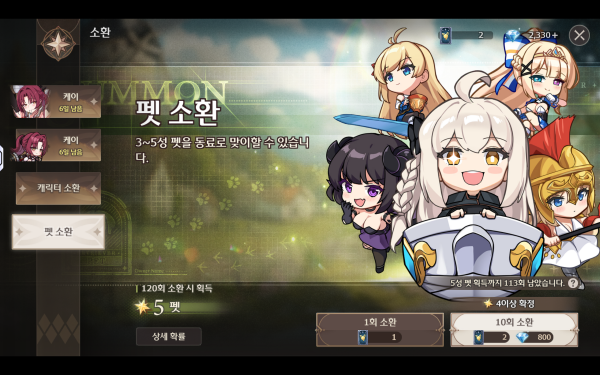 가챠는 캐릭터와 펫으로 간단하게 구성했다. 특히, '로스트 소드'는 비슷한 부류의 게임에서 자주 볼 수 있는 리세마라가 필요 없을 정도로 덱의 구성이 자유롭고, 4, 5성급 캐릭터를 꽤 잘 주는 편이다. 5성급 캐릭터의 픽업 확률은 캐릭터 개별로는 0.1250%지만, 전체로는 3%라 유저 지향적으로 책정된 듯한 느낌이다.