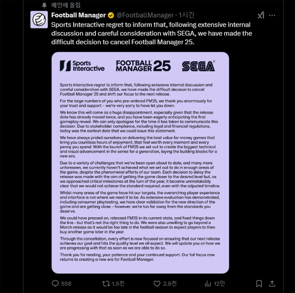 스포츠 인터랙티브는 마지막으로 "풋볼 매니저 25의 발매는 취소됐지만, 우리는 다음 작품이 기대하는 완성도에 충족할 수 있도록 노력할 것이다. 추가 진행 상황에 대해서는 가능하면 빠르게 공유 드리겠다"고 밝혔다.