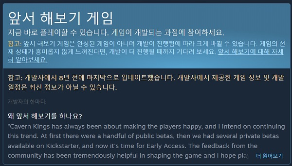 하지만 종종 이 방식을 악용하는 업체도 존재하기 마련입니다. 기대감을 올려놓고 얼리 액세스로 매출을 거둔 뒤, 업데이트를 차일피일 미루며 개발을 진행하지 않는 거죠. 이 정보가 마땅히 확인이 안되기에 신규 유저가 구매를 할 수도 있는 상황이 이어졌습니다.
