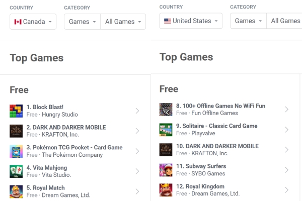 7일 구글 플레이스토어 기준으로 양국에서 액션 게임 부문 1위를 차지했고, 게임 앱 중에서는 캐나다에서 2위, 미국에서 10위를 차지했습니다. 전체 순위로는 캐나다에서 11위, 미국에서 66위를 차지하며 캐나다에서 더 좋은 반응을 보였습니다. 크래프톤 측은 올해 상반기 중 순차적으로 글로벌 출시를 진행한다는 계획입니다.