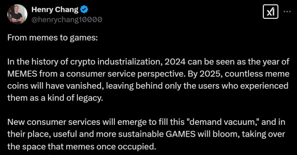 장 대표는 10일 자신의 X(구 트위터)를 통해 '밈(MEMES)에서 게임'이라는 주제를 들며 "2024년은 밈코인의 해였다. 그러나 2025년에는 수많은 밈코인이 사라지고, 이를 경험한 사용자들만이 일종의 유산으로 남을 것"이라고 전망했다.