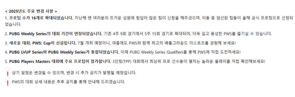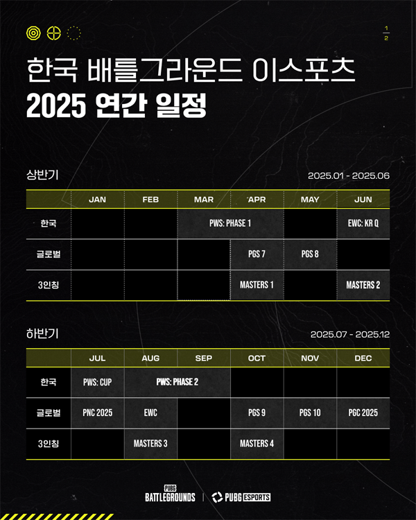 3월 본격적인 리그 개막에 앞서 크래프톤은 드디어 '2025 한국 배틀그라운드 e스포츠 연간 일정'을 공개했다. 기존에 공개된 글로벌 일정에 한국 일정들이 추가됐으며, 펍지 위클리 시리즈(PWS)의 기간 확대, 컵 대회 신설 및 하위 리그의 통합 등이 공지됐다.
