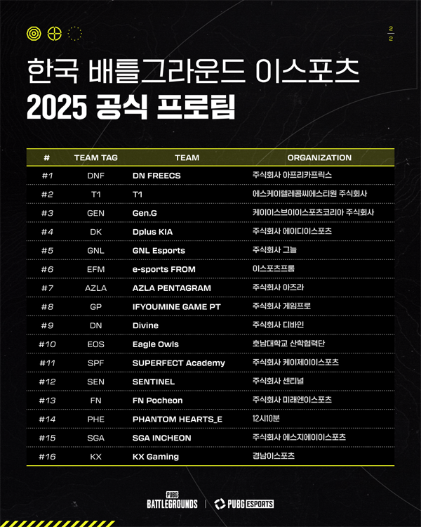 마지막으로 크래프톤은 2025년에 국내 '배틀그라운드' e스포츠와 함께할 16개의 공식 프로팀을 공개했다. 더욱 확대된 명단에서는 기존에 국내외에서 좋은 모습을 보여준 DN 프릭스(전 광동)와 젠지, T1, 디플러스 기아는 물론 꾸준히 공식 리그에서 성과를 거둔 프로팀들이 모두 이름을 올렸다.