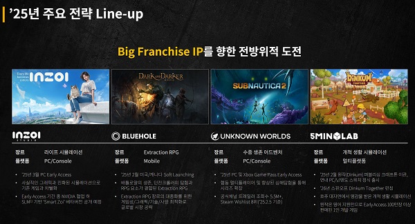 그 외 신규 성장 동력도 꾸준히 확보한다. 스케일업 크리에이티브 전략을 통해 내외부에서 확보한 다양한 IP를 선보인다. 여기에는 3월 얼리 액세스가 예정된 라이프 시뮬레이션 게임 ‘인조이’와 모바일 익스트랙션 RPG ‘다크앤다커 모바일’, 언노운월즈의 수중 생존 어드벤처 게임 ‘서브노티카2’를 출시한다.