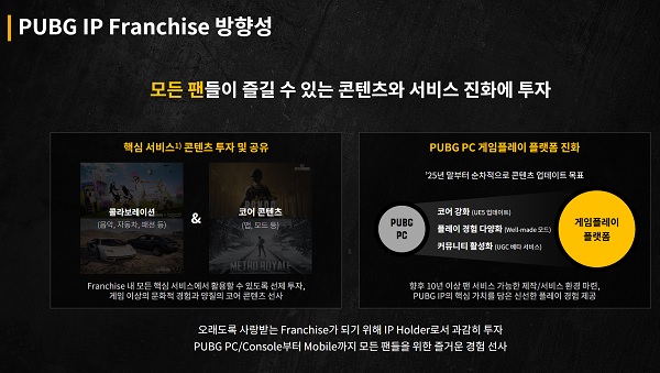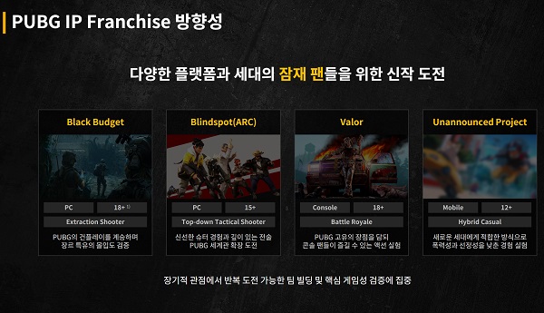 IP 다변화를 위해 ‘배틀그라운드’ 기반의 신작도 꾸준히 내놓는다. 익스트랙션 슈터 장르의 ‘블랙버짓’과 탑다운 전술슈터 장르의 ‘블라인드스팟’, 서구권 콘솔 플랫폼 기반의 컨트롤러 기반 배틀로얄 게임 ‘밸러’, 그리고 청소년 대상으로 하이브리드 캐주얼 장르의 모바일 프로젝트도 추진하며 IP 확장과 핵심 게임성의 검증에 집중한다.